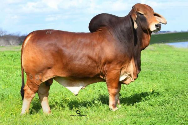 On the sire side, +Mr. Fontenot 333 “Rufus” — the 2016 International Champion Red Bull — contributes global sire influence. His offspring have dominated in the United States, Central America, and Asia, making him one of the breed’s most recognized names. His value extends beyond show-ring success: Rufus’ outcross pedigree allows strategic flexibility with nearly all major Red Brahman lines.